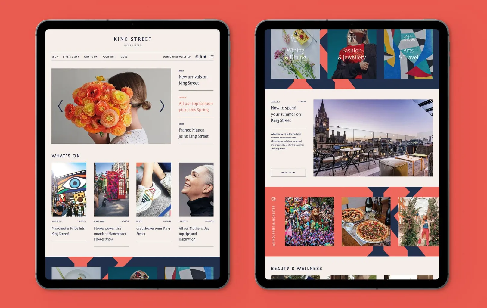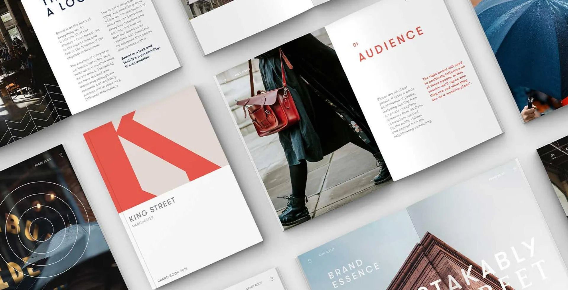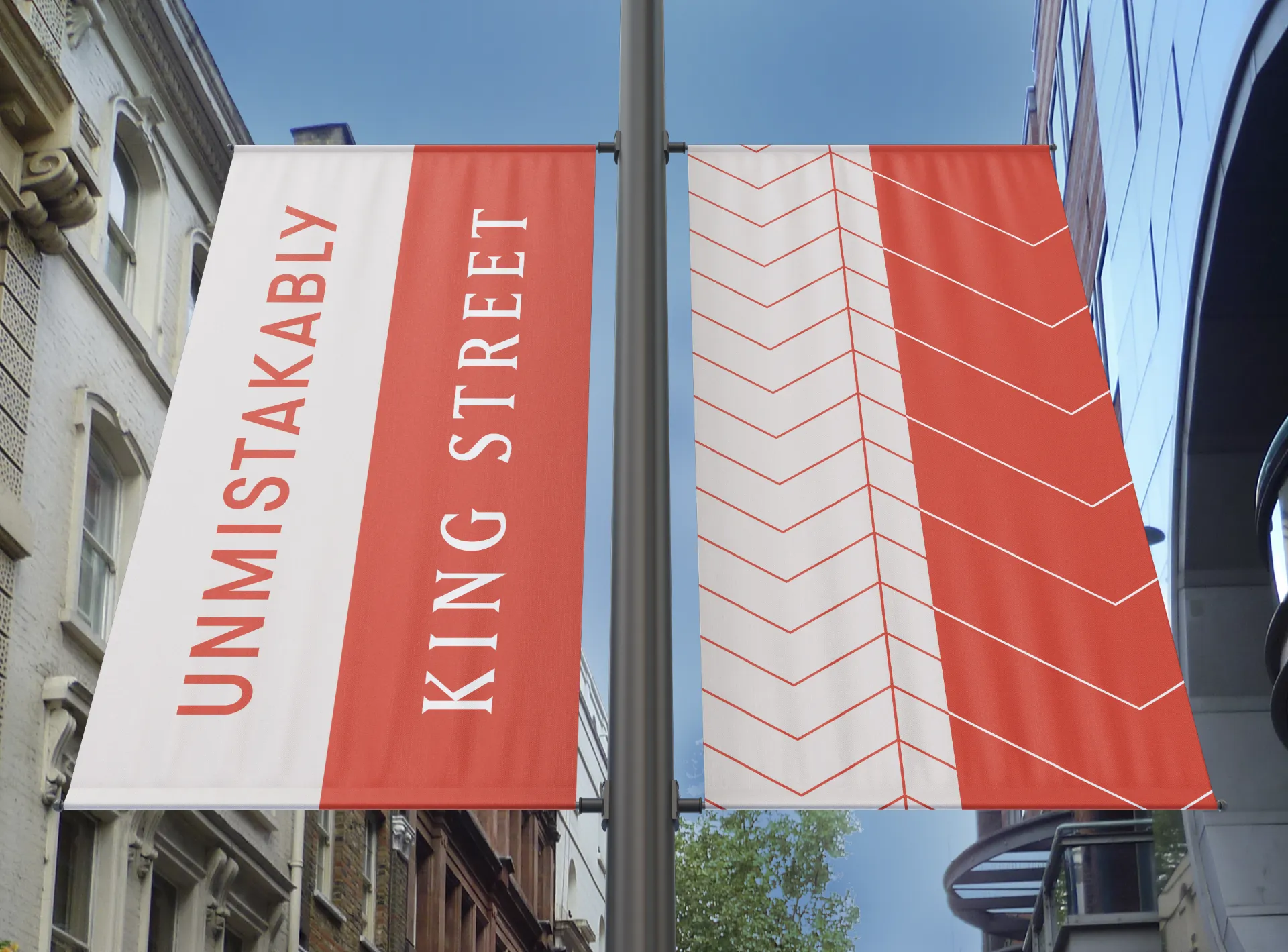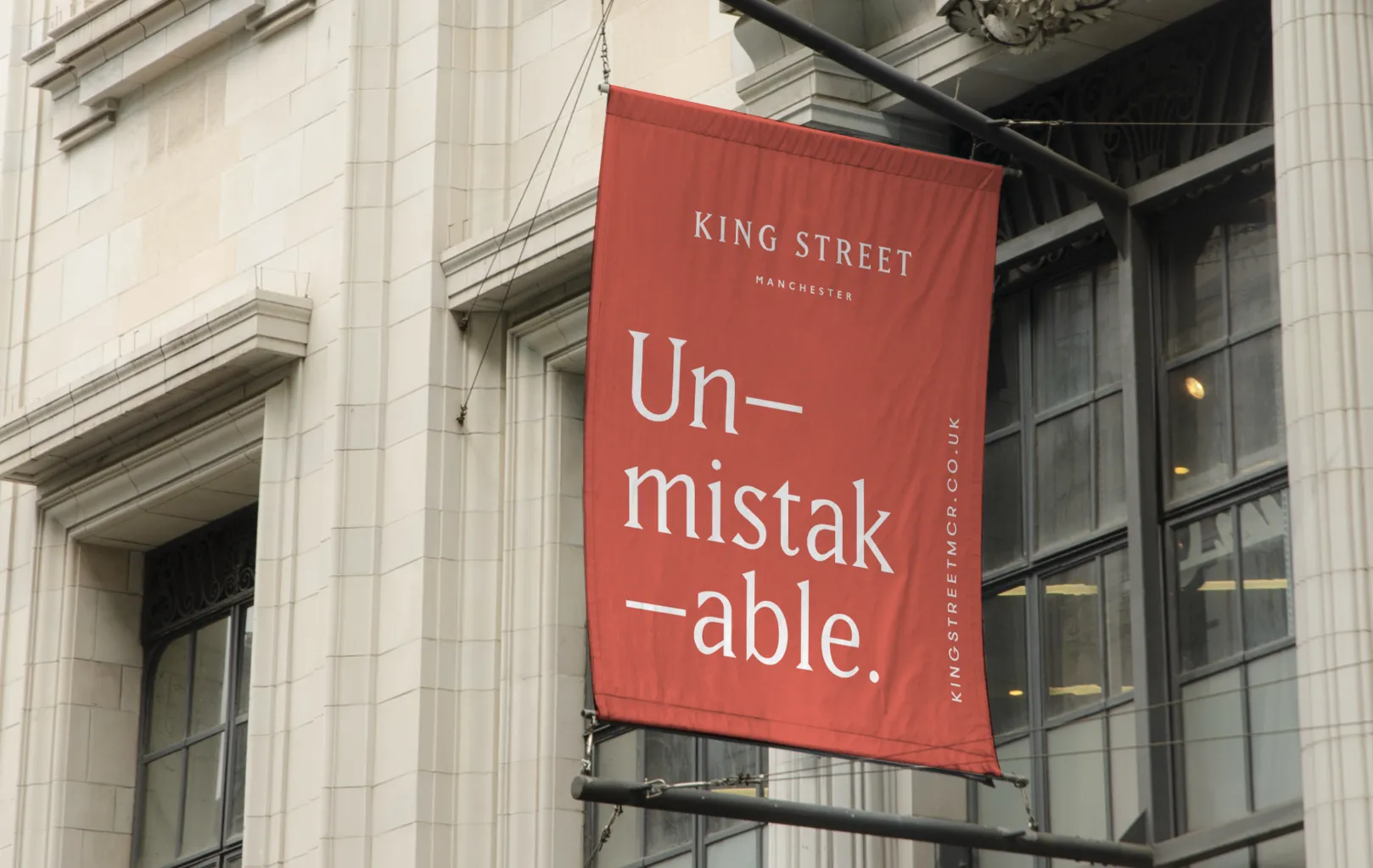 The new brand draws inspiration from Manchester’s industrial heritage, combining historic architecture with graphic references to textile patterns and craftsmanship. This distinctive identity gave King Street a confident voice and visual language, reinforcing its position as a refined yet authentic Manchester destination.